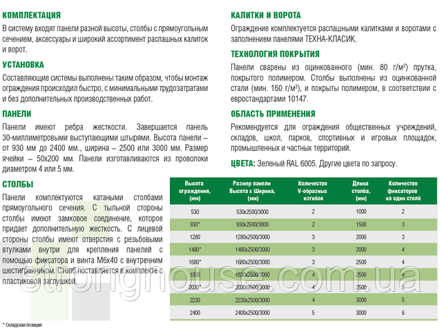 | Призначення огорожі | Для адміністративних будівель та територій, Для котеджів і будинків, Для промислових об'єктів, Для спортивних об'єктів і територій, Для паркових зон |